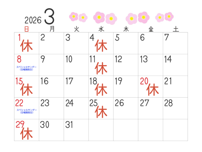 3月の開院カレンダーをご案内します。 ご予約お問合せはお電話またはWeb予約へどうぞ https://2.onemorehand.jp/domo/